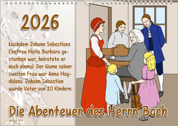 Auf der linken Seite ist es ein Bach-Kalender, auf der rechten Seite ist es Die Kleine Bach-Figur. Den Kalender können Sie in drei Größen bekommen. Dieses Jahr und nächstes Jahr ... hier gibt es mehr Information.